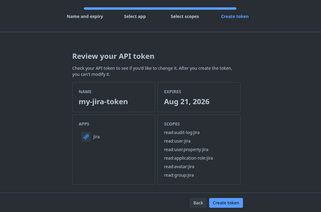 Select granular permissions, depending on which inputs you plan to use the token for. The below cover all current Atlassian Jira inputs.