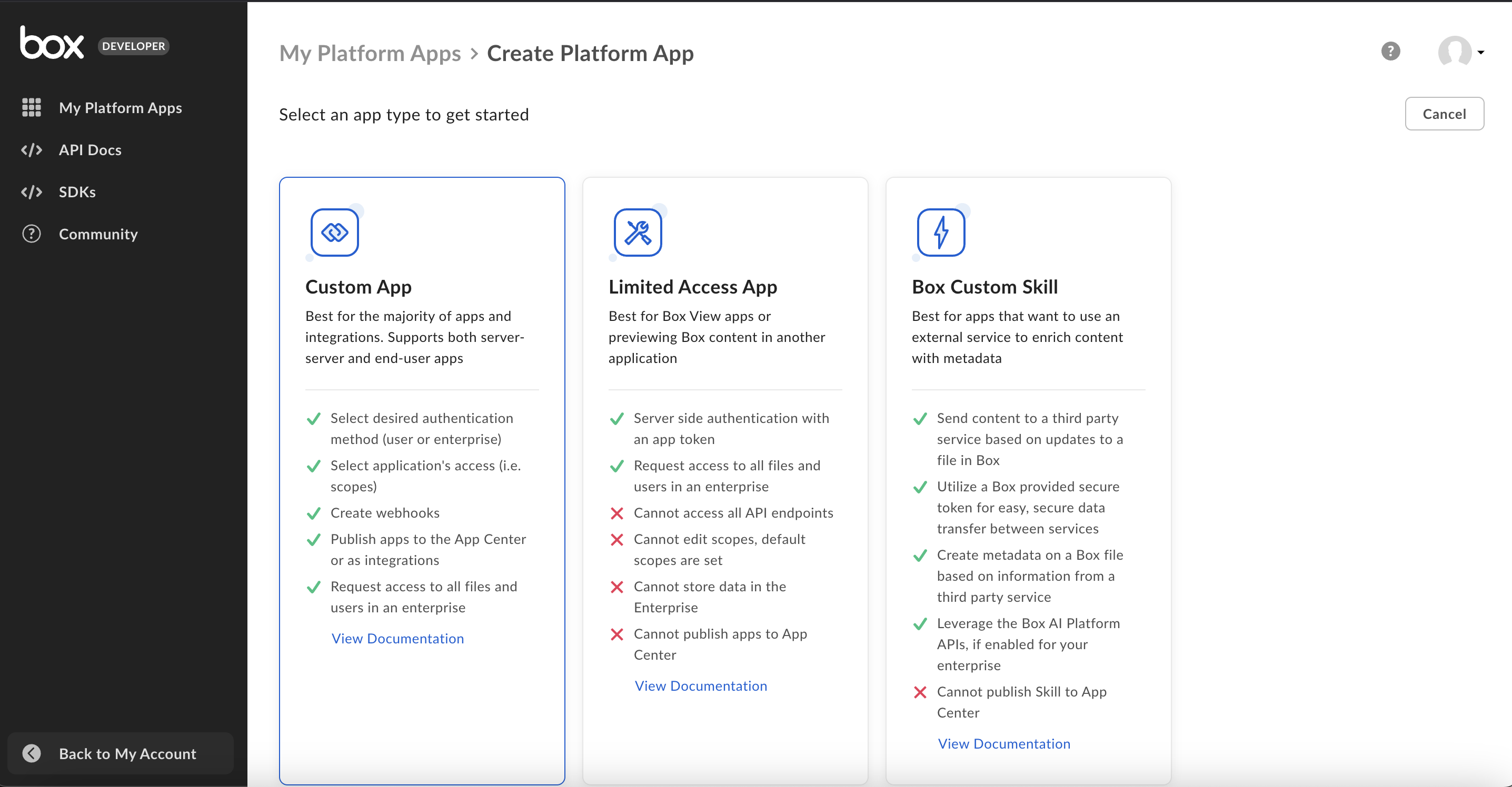 - Navigate to the Developer Console from your Box user dashboard (Requires Admin/Co-Admin Access to the enterprise)