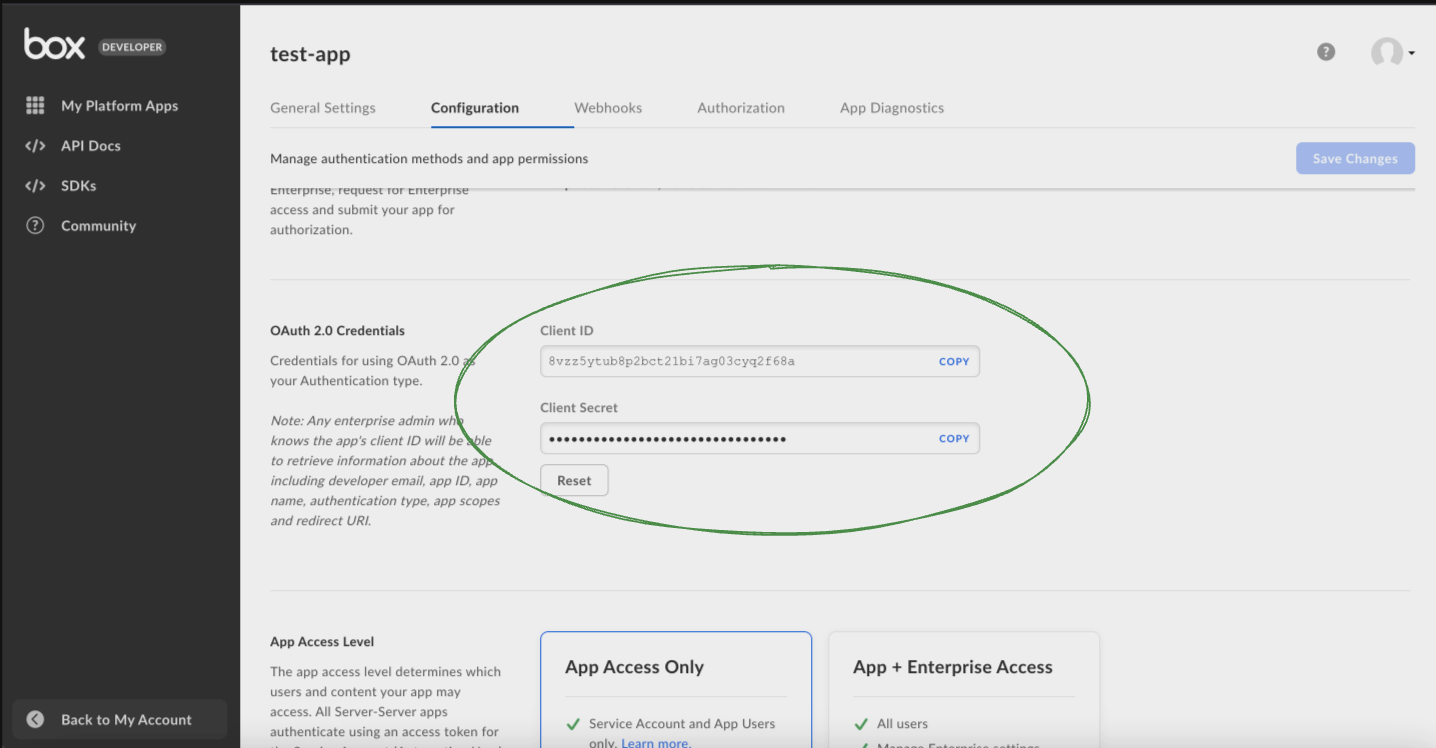 - Go to the 'Configuration' after choosing the right app from the developer dashboard in the 'My Platform Apps' section, and scroll down to 'OAuth 2.0 Credentials' section, and setup 2FA if required, after which obtain your Client ID and Client Secret to connect Box to Monad.