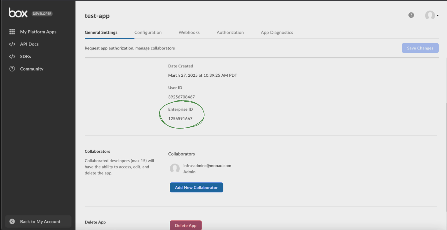 | Enterprise ID | string | Yes | Enterprise ID for the Box API. This is required to authenticate requests. |
