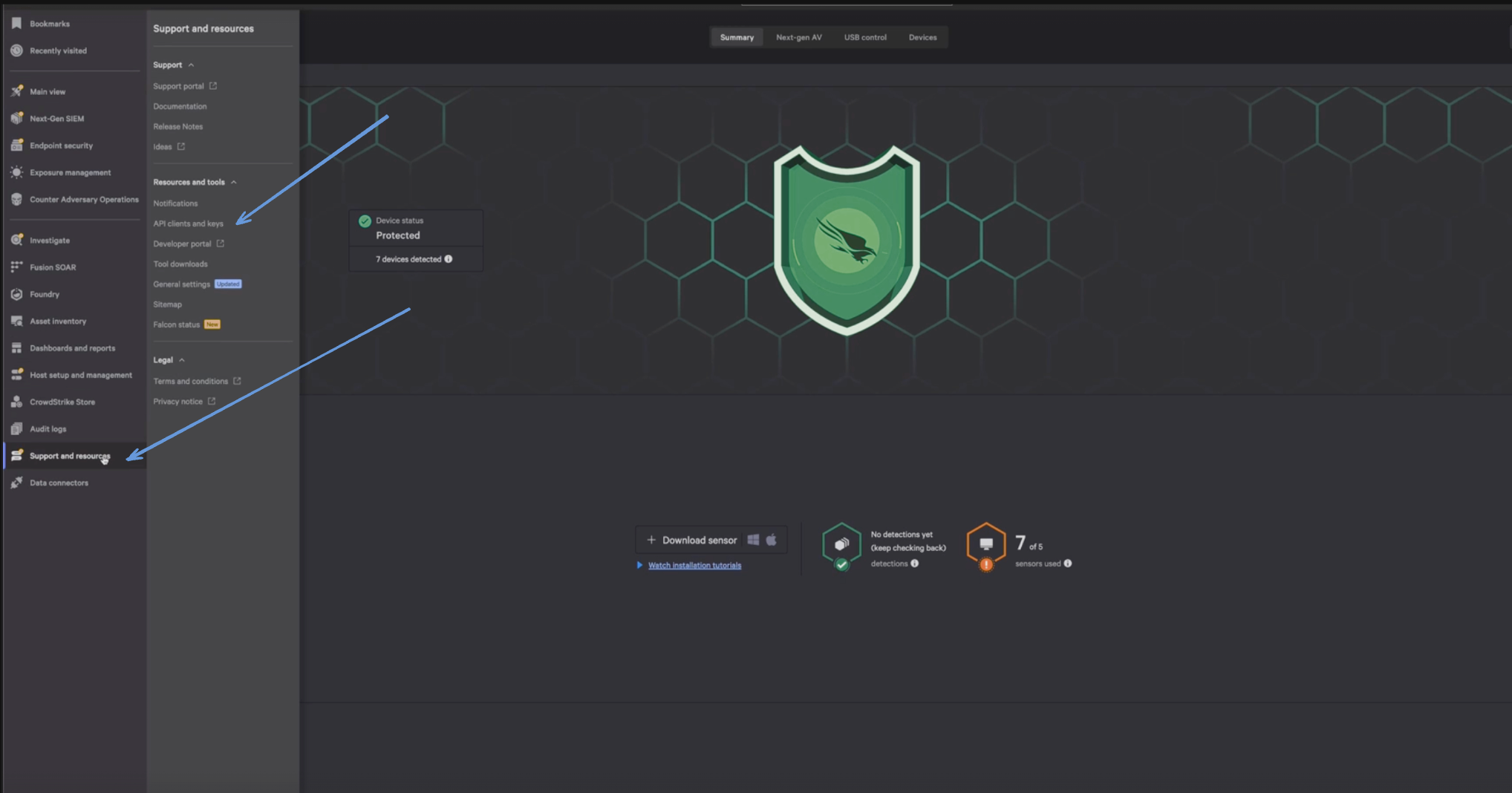 - Before you connect Monad to CrowdStrike, you need a Client ID and Client Secret. Log in to your CrowdStrike portal, and under Support & Resources, click on 'API Client and Keys' to create your credentials.