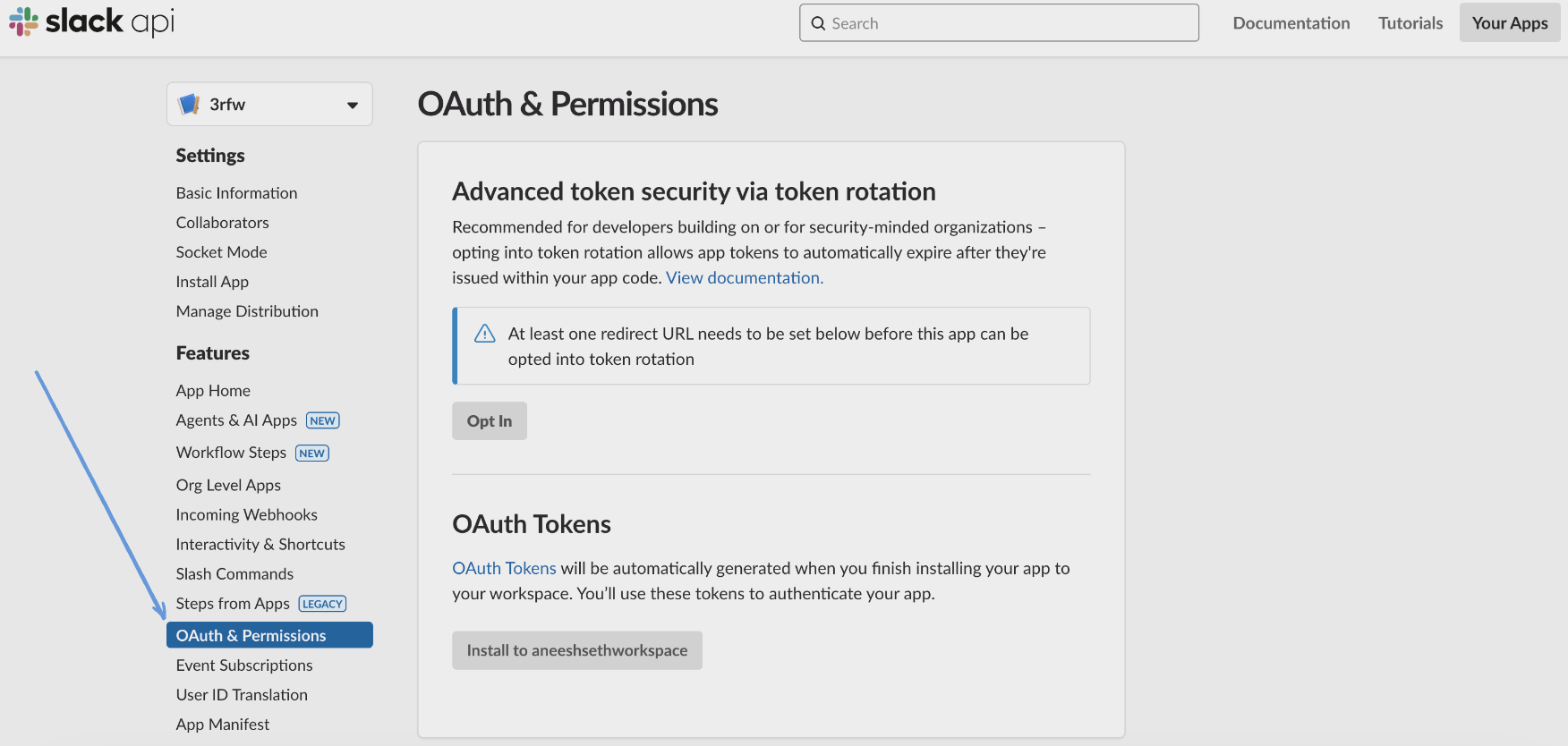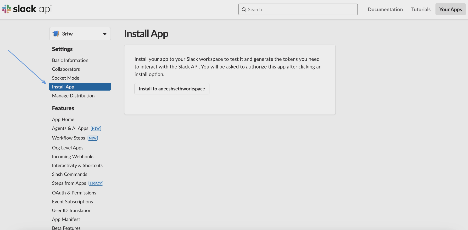 - Once that's done, install the slack app to your workspace from the section in the image below, after which you will receieve your slack token to connect to Monad.