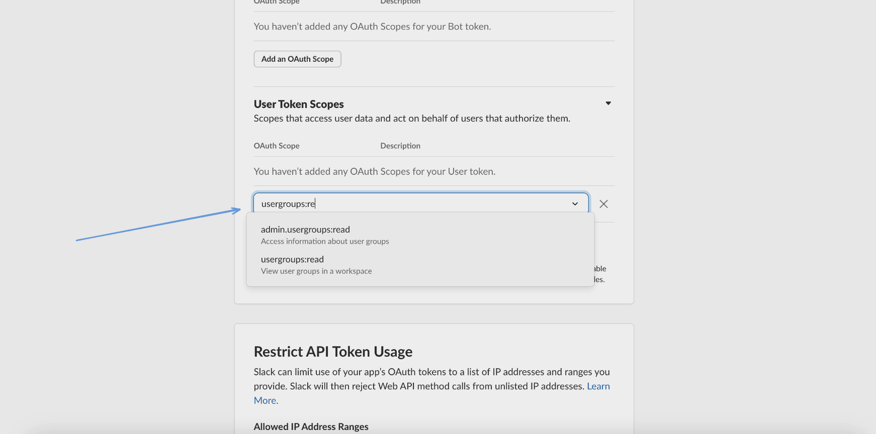 - Under Bot/User Token Scopes, select Add an OAuth Scope.