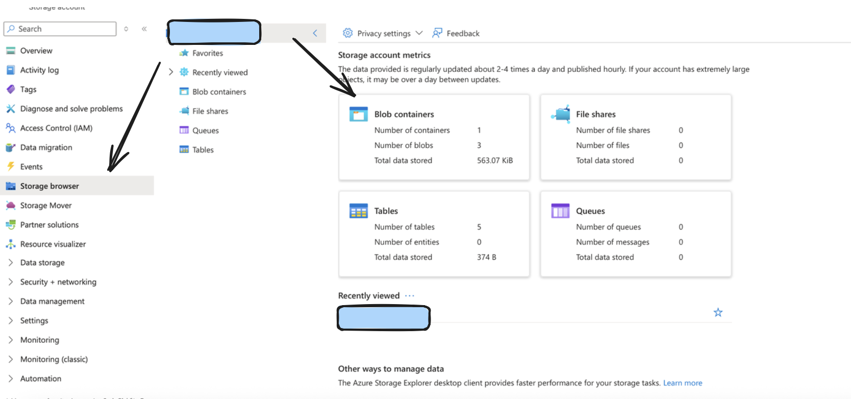 After doing so, create a container by going to the storage browser on the left sidebar, and choosing the Blob Containers widget. The name of your storage account in the format https://account_name.blob.core.windows.net typically would be your Account URL.
