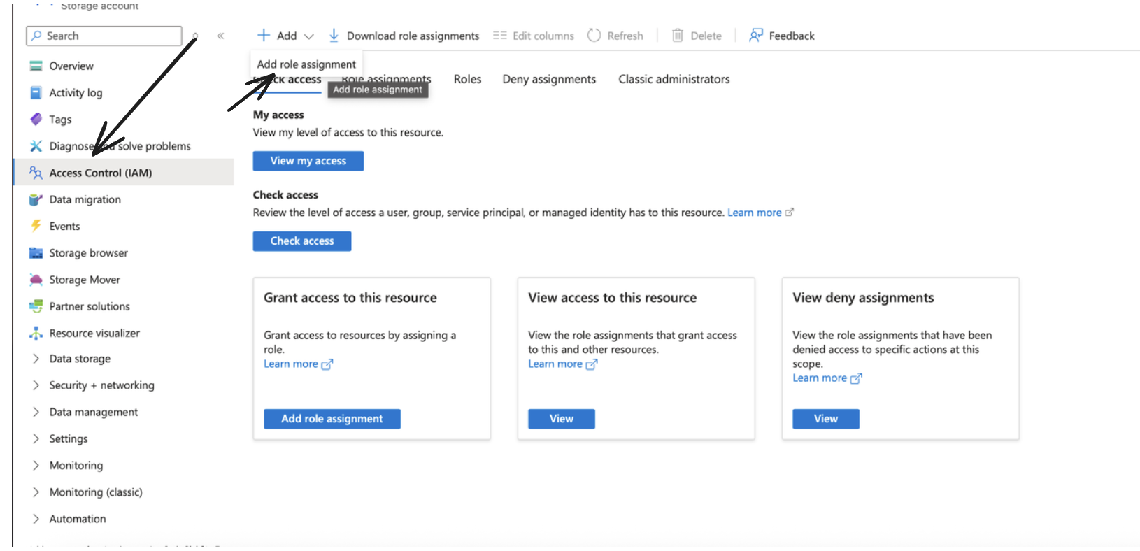 After doing so, go to your storage account, and under IAM, click on Add to add a new Role Assignment.