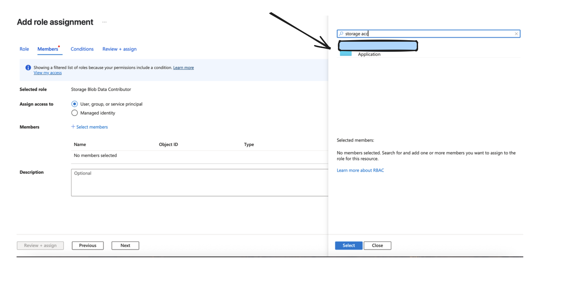 Make sure to choose the Storage Blob Data Contributor role and click next.