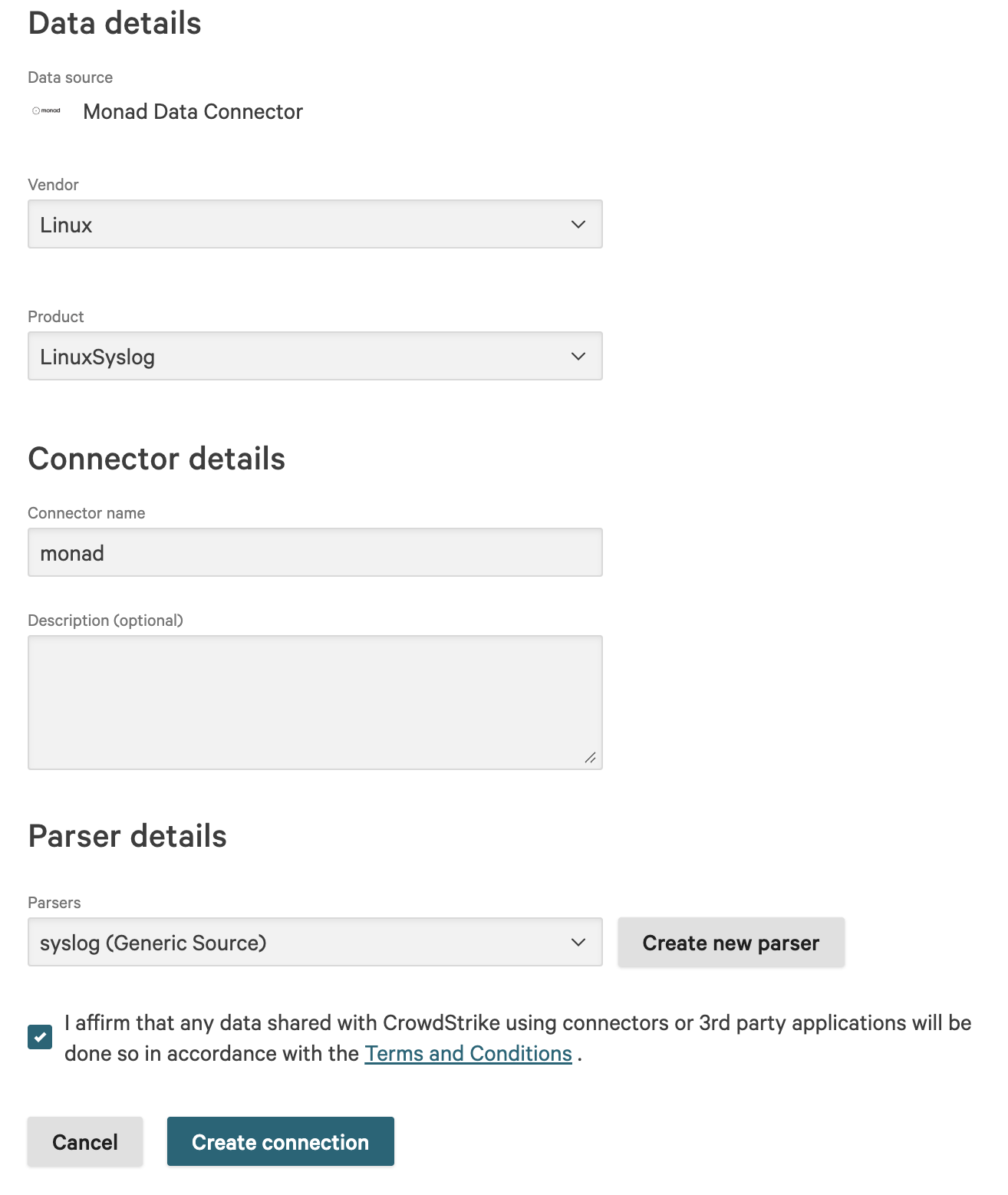 Configuration page for the Monad connector in CrowdStrike