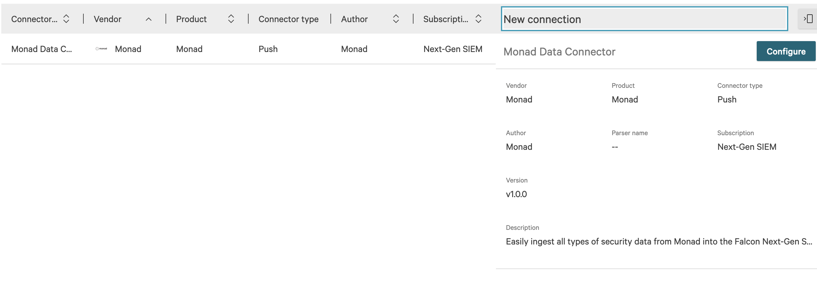 The Monad connector shown in the CrowdStrike Data Sources page