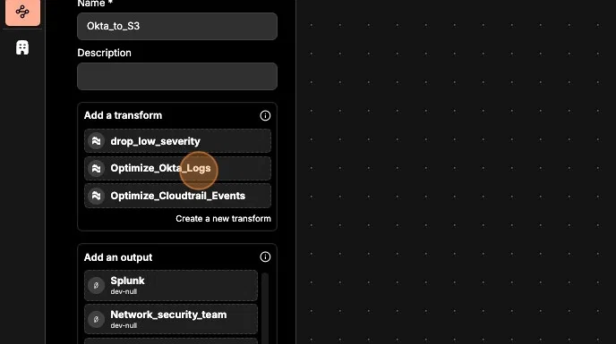 - Drag the "Optimize_Okta_Logs" transform into the pipeline builder and place it between your input and output nodes.