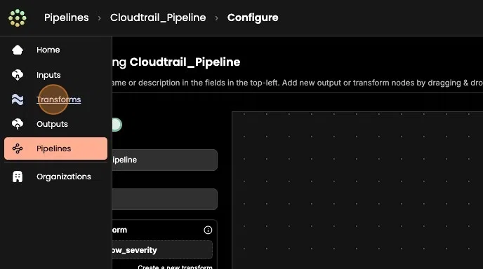 - Next, we'll create a few transform operations to optimize our CloudTrail events.