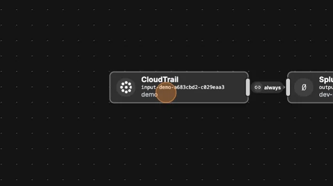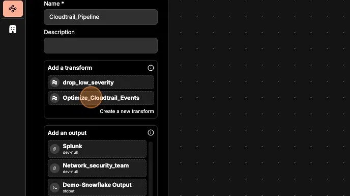 Now that the "Optimize_CloudTrail_Events" transform is applied, we'll add our IAM Security Team's preferred output destination, Snowflake and then we'll apply intelligent data routing to ensure the IAM team receives their highest-priority Cloudtrail events.